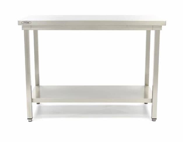 Ovaj visokokvalitetni radni sto ima radnu ploču sa savijenim ivicama. Ivice su takođe zavarene i polirane. Uredno završen radni sto bez oštrih ivica je najbolji za bezbedno radno okruženje. Ovaj radni sto nema podignutu ivicu pozadi. Polica ispod nudi prostor za dodatno skladištenje i idealna je za smeštaj kuhinjskog pribora. Pomaže da radni prostor bude čist i prazan. Podnožje stola se ne može podesiti po visini. Radni sto dolazi ravno upakovan, što znači da će ga morati sastaviti. Ovo uopšte nije problem sa isporučenim alatima i vrlo jednostavnom montažom. U roku od 10 minuta, radni sto od nerđajućeg čelika je spreman za upotrebu u kuhinji.